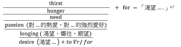 a hunger for adventure/knowledge/success對冒險/知識/成功的渴望 a longing for his homeland 他對家鄉的嚮往 We have no need of your sympathy. 我們不需要你的同情。 I'm in need of a drink.但我想喝杯東西。 Anton has a consuming passion for science fiction. 安東對科幻小說癡迷不已。 There is a strong desire for peace among the people.人民極盼和平。 |