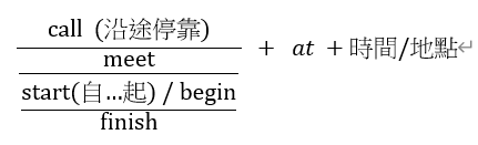 Ticket prices start at NTD 500 and go up to NTD 2000. 票價從台幣五百元起,到最高台幣二千元都有。 Hotel prices start at NTD 1000 for a single room. 旅館的單人房價格從台幣一千元起。 The cruise ship is expected to call at the Port of Gothenburg. 遊輪預計會短暫停靠哥德堡港。 The film they want to watch begins at seven. 他們要看的電影七點開場。 |
