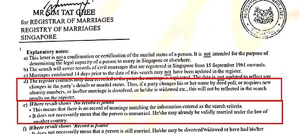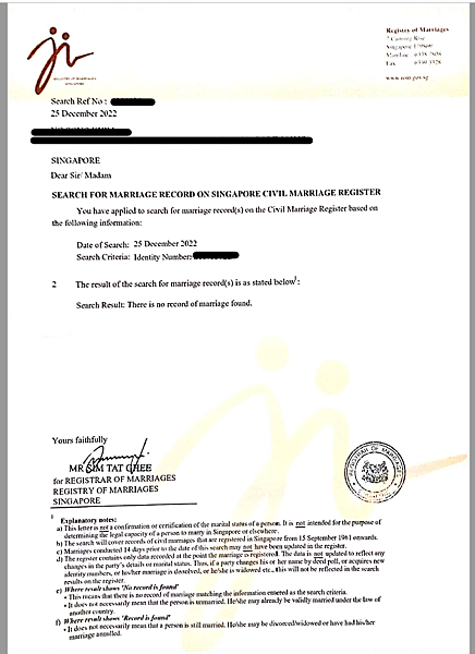 💥 新加坡沒有單身證明文件,僅有 婚姻搜尋結果單💥