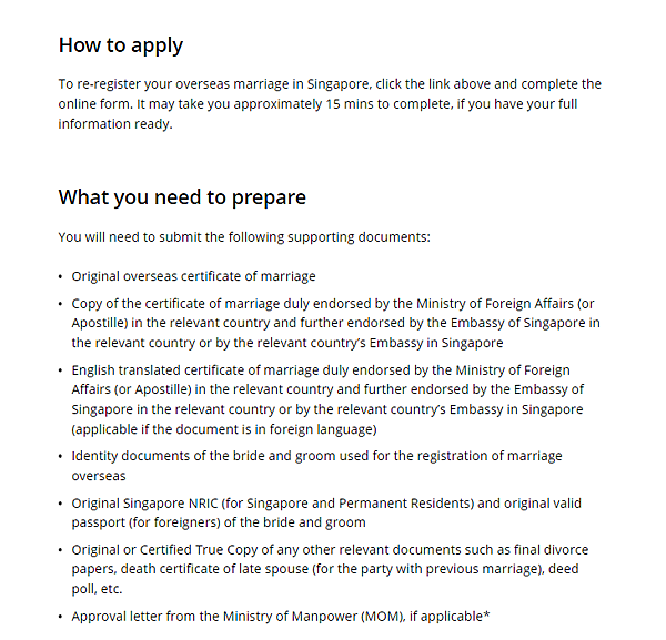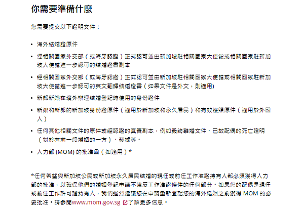 1.台灣結婚證書原件 (須經台灣文件拿到新加坡認證方式: 即 在台灣合格翻譯社翻譯成英譯➡公證人公證➡駐新加坡台北商辦處(仁愛路) )